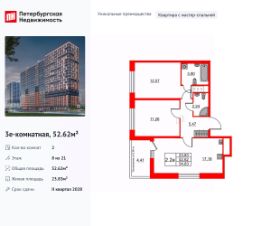 Уникальная, функциональная европланировка, большая кухня-гостиная 17.18 м², вместительная прихожая 5.47 м². Общая площадь квартиры - 52.62 м², жилая 23.83 м², высота потолка 2.77 м.