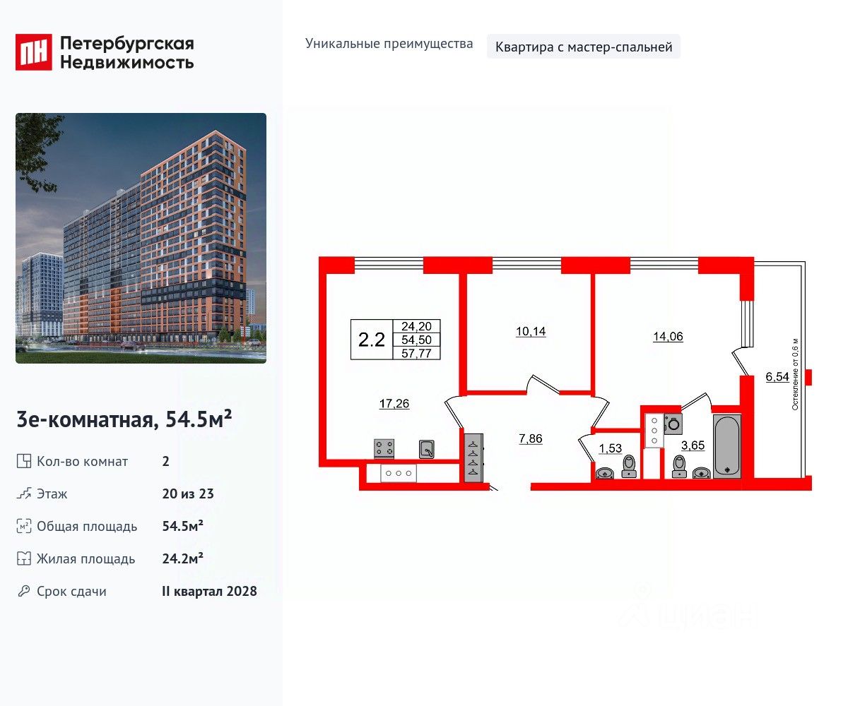 Уникальная, функциональная европланировка, большая кухня-гостиная 17.26 м², просторная прихожая 7.86 м². Общая площадь квартиры - 54.5 м², жилая 24.2 м², высота потолка 2.77 м.