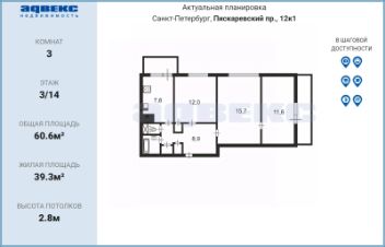 Продается 3-х комнатная квартира 60.6 кв.м с ДВУМЯ застекленными лоджиями в кирпичном доме по адресу: Пискаревский проспект, 12к1.