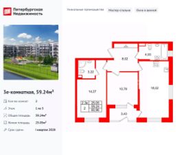 Уникальная, функциональная европланировка, большая кухня-гостиная 18.02 м², вместительная прихожая 8.02 м². Общая площадь квартиры - 59.24 м², жилая 25.05 м², высота потолка 2.77 м.