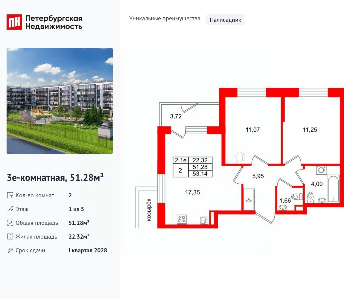 Уникальная, функциональная европланировка, большая кухня-гостиная 17.35 м², вместительная прихожая 5.95 м². Общая площадь квартиры - 51.28 м², жилая 22.32 м², высота потолка 2.77 м.