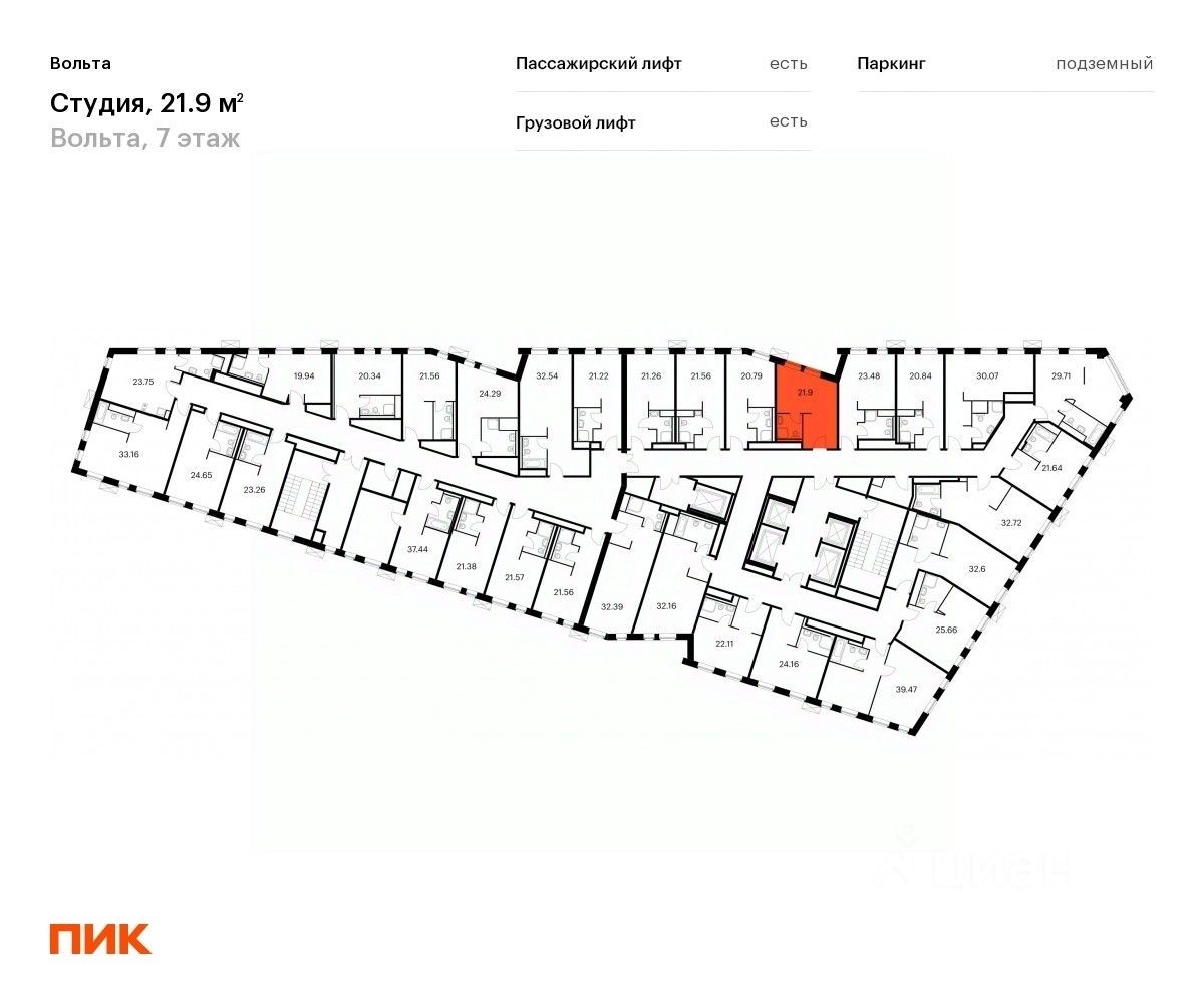 Продаются апартаменты-студия площадью 21,9 кв.м на 7 этаже 15 этажного дома (Вольта, Секция 1) проекта ПИК Вольта.