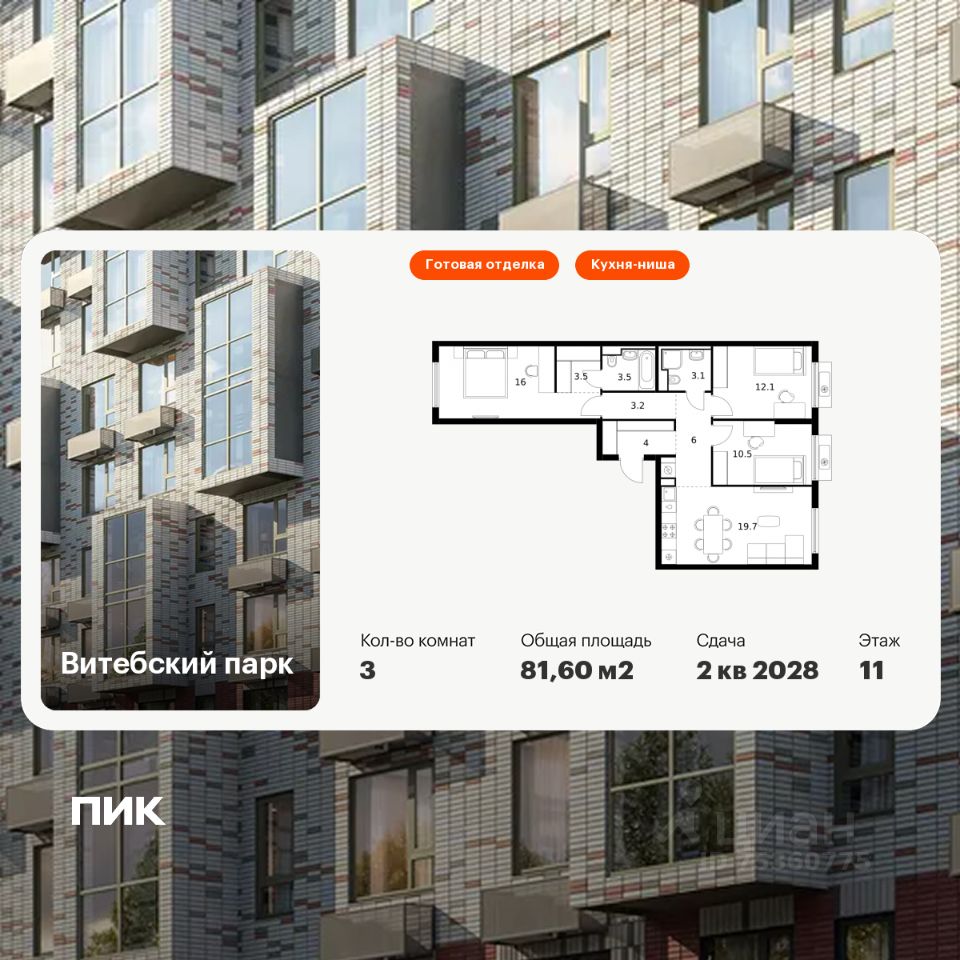 Продаётся 3-комн. квартира площадью 81,6 кв.м на 11 этаже 12 этажного дома (Корпус 7, Секция 2) проекта ПИК Витебский парк. Светлый просторный подъезд на уровне земли, функциональная планировка, большие окна, c отделкой.