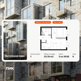 Продаётся 1-комн. квартира площадью 32,1 кв.м на 6 этаже 12 этажного дома (Корпус 6, Секция 2) проекта ПИК Витебский парк. Светлый просторный подъезд на уровне земли, функциональная планировка, большие окна, предчистовая отделка.