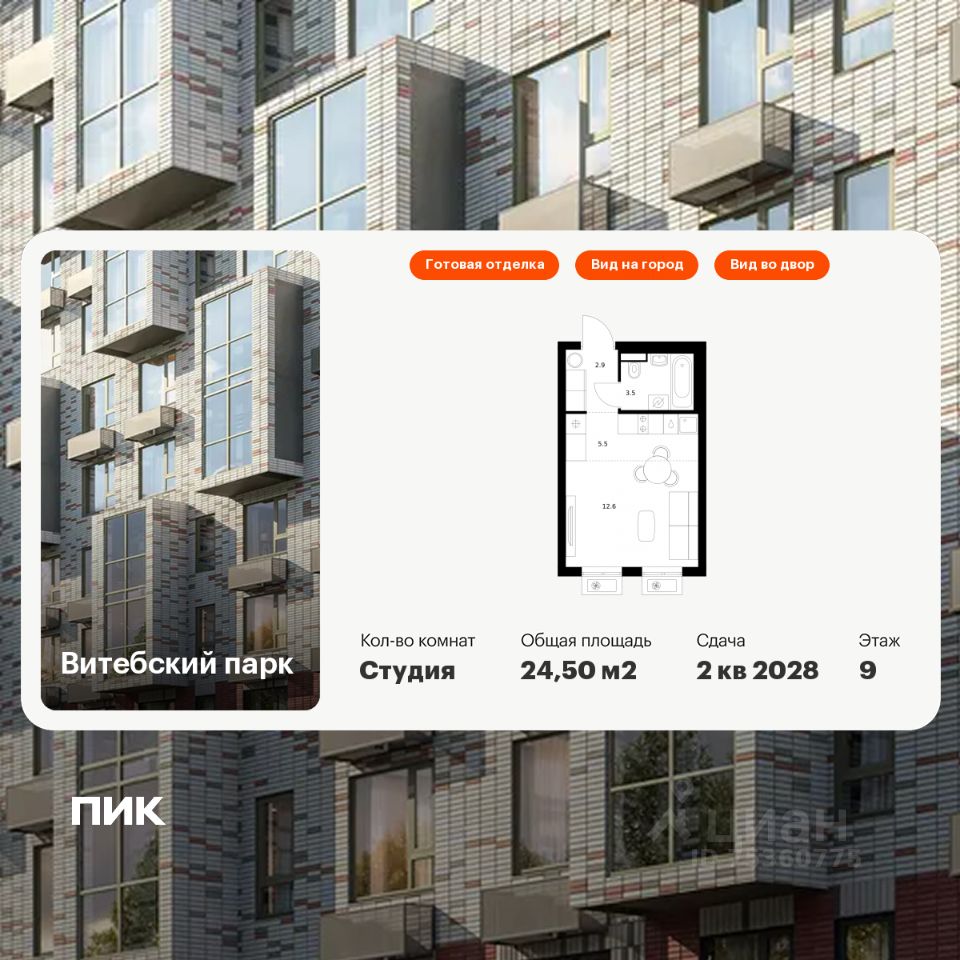 Продаётся квартира-студия площадью 24,5 кв.м на 9 этаже 12 этажного дома (Корпус 6, Секция 3) проекта ПИК Витебский парк. Светлый просторный подъезд на уровне земли, функциональная планировка, большие окна, c отделкой.