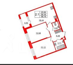 Общая площадь квартиры с учетом балкона 59,9м2 , с учетом кухни 18.4 м2, и двух комнат по 12,8м2 и 13.1м2жилая — 18 кв. м. Высокие потолки 2.77 метра создают ощущение простора. Из окон открывается вид во двор с паркингом и боковой вид Малую Неву.