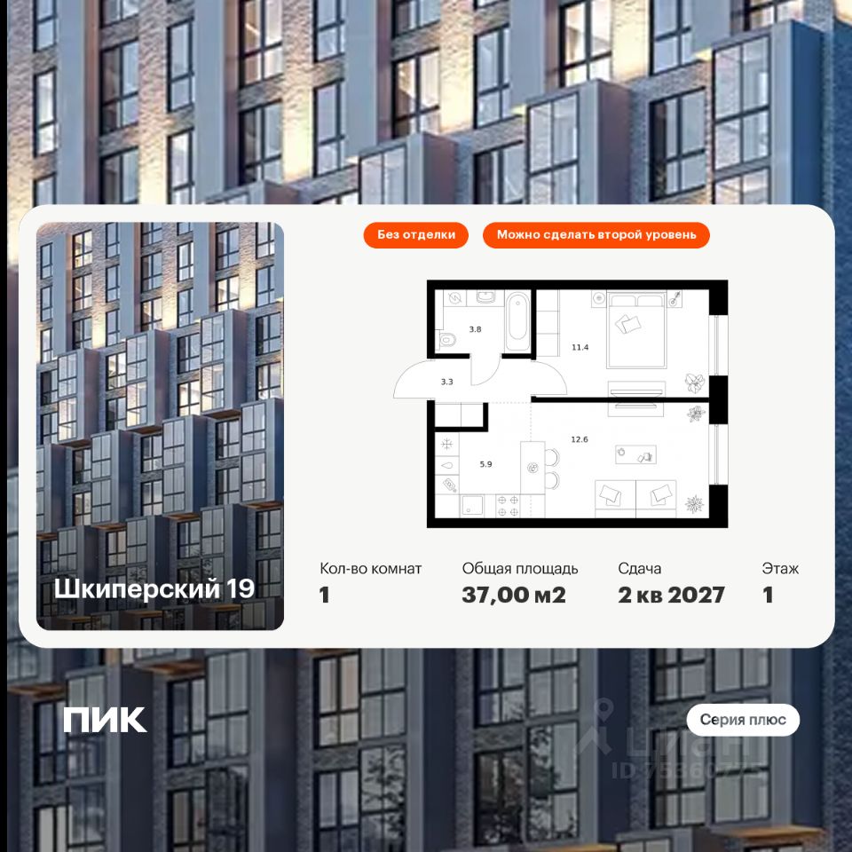 Продаётся 1-комн. квартира площадью 37 кв.м на 1 этаже 8 этажного дома (Корпус 2, Секция 3) проекта ПИК Шкиперский 19. Светлый просторный подъезд на уровне земли, функциональная планировка, большие окна, без отделки.