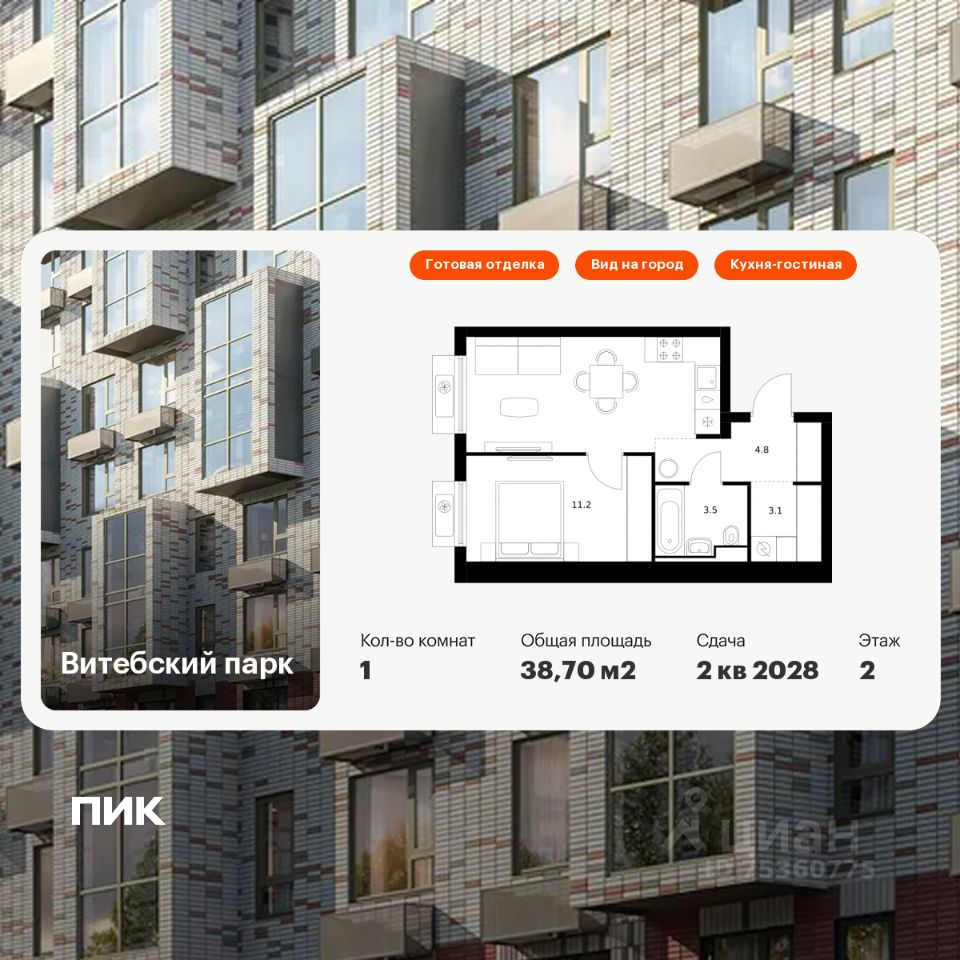 Продаётся 1-комн. квартира площадью 38,7 кв.м на 2 этаже 12 этажного дома (Корпус 7, Секция 5) проекта ПИК Витебский парк. Светлый просторный подъезд на уровне земли, функциональная планировка, большие окна, c отделкой.