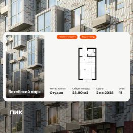 Продаётся квартира-студия площадью 23,9 кв.м на 11 этаже 12 этажного дома (Корпус 7, Секция 4) проекта ПИК Витебский парк. Светлый просторный подъезд на уровне земли, функциональная планировка, большие окна, c отделкой.