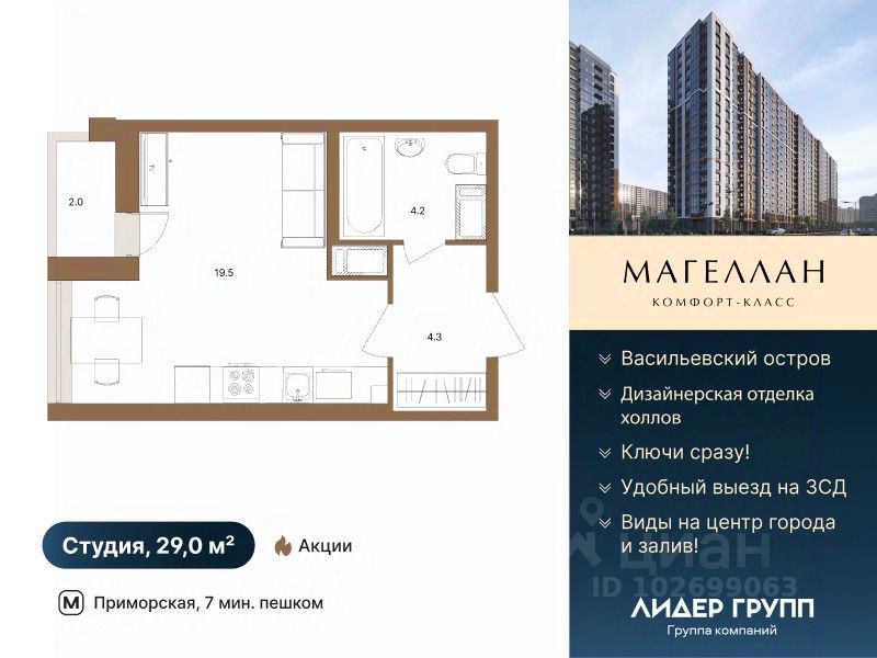 Дом сдан. Ключи в день сделки! ЖК Магеллан - кирпично-монолитный дом комфорт-класса возведен с применением технологии навесного вентилируемого фасада. 18-этажный ЖК в самом сeрдцe Санкт-Пeтepбурга нa Вacильeвcкoм островe. Пpocторныe квapтиpы для жизни бeз oгpаничeний! Hамывнaя тeрритоpия бepeгa Финскoгo залива, oблaдая вcеми пpeимущeствами современной инфраструктуры, расположена в исторической части города, имеет удобную логистику и транспортную доступность. 7 минут пешком до метро Приморская. Удобный выезд на ЗСД и КАД. 15 минут до Невского проспекта, 20 минут до аэропорта Пулково и Московского вокзала. На квартиры ЗПИФ и переуступки семейная ипотека не распростаняется! Ключи сразу! Преимущества: комфорт-класс, близость к центру, панорамный вид на центр города и Финский залив, увеличенные окна во всех квартирах, высота потолков 2,75м, колясочные, велосипедные и помывочные для собак в каждой парадной.