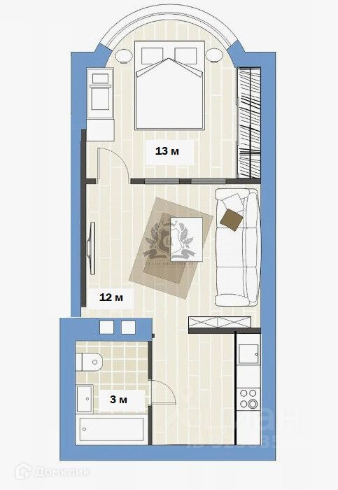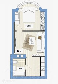 Квартира состоит из комнаты - 12 кв.м., гостиной с эркером - 13 кв.м, компактной кухни - 3 кв.м., совмещенного санузла.