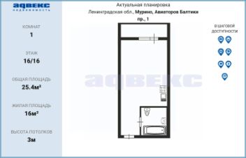 По документам общая площадь 25,4 м2 расположена на 16 этаже 16-ти этажного монолитного дома ЖК