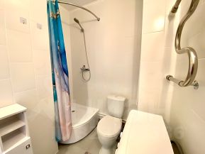 Ванная — маленький оазис релакса: белоснежная плитка, современный туалет, раковина с хромированным смесителем, стиральная машина и даже подогреваемый полотенцесушитель — всё продумано для вашего комфорта.