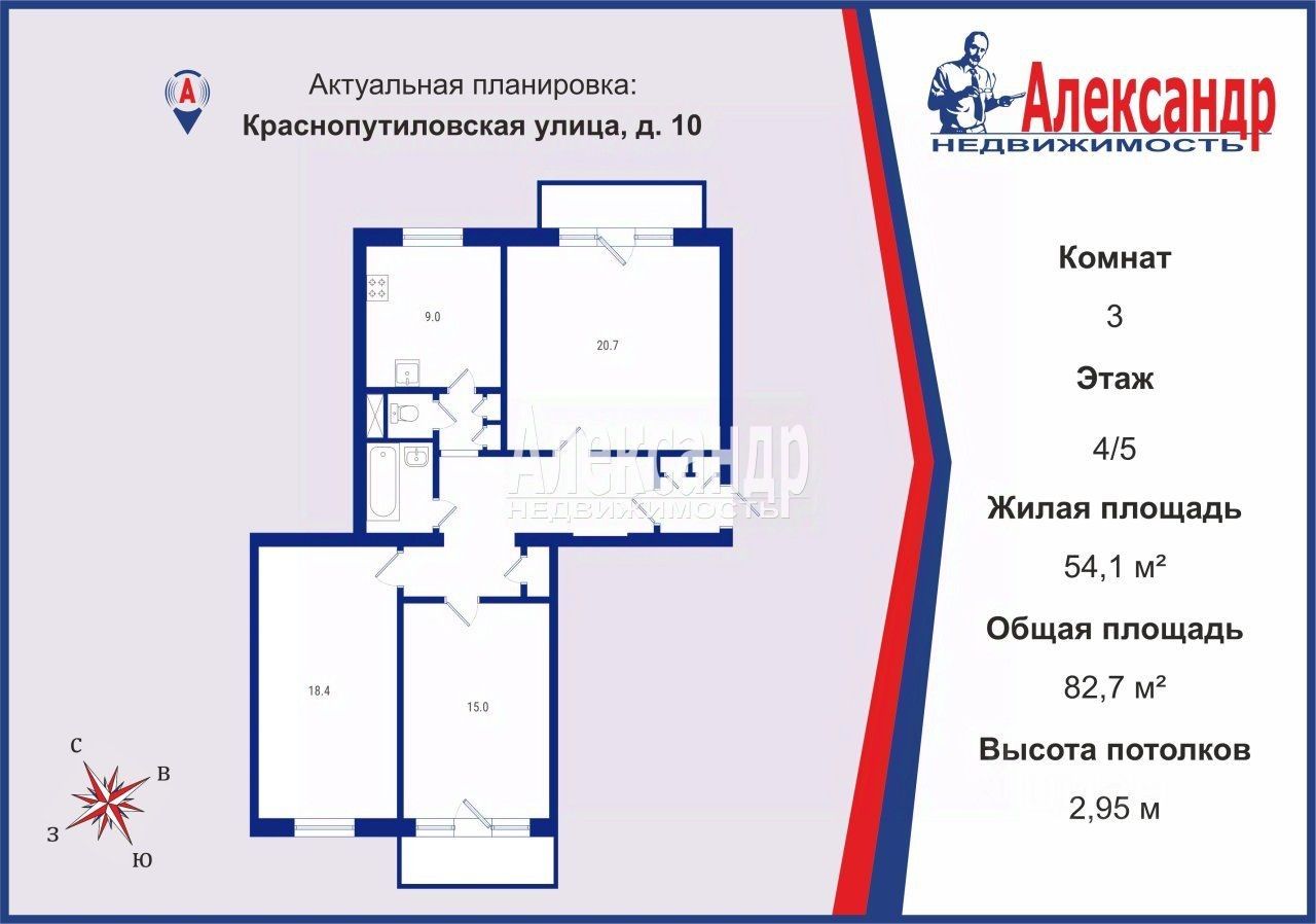 По площади: комната 20,7 кв.м, вторая комната 18,4 кв.м, третья комната 15 кв.м, кухня 9 кв.м, ванная 3.4 кв.м, туалет 1.3 кв.м, коридор 19,6 кв.м. Высокий потолок 2,95 метра.