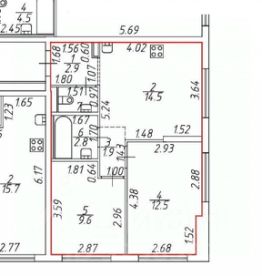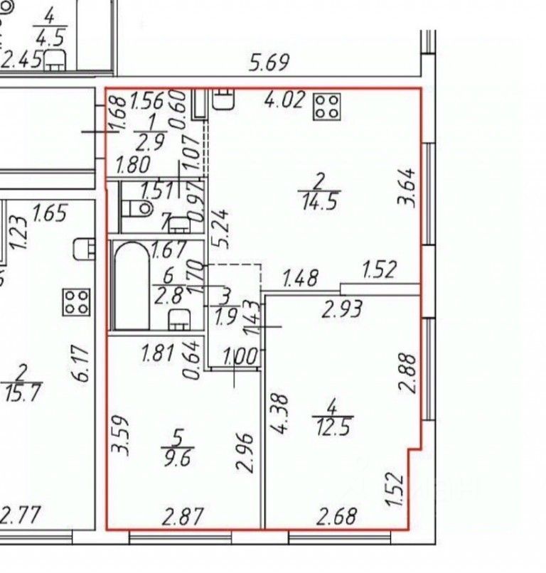 Две изолированные комнаты (12,5 м² и 9,6 м²) и просторная кухня-гостиная (14.5 м²).