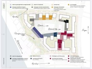 Первые этажи домов со стороны двора займут рестораны и кафе, магазины одежды и предметов декора, супермаркет, мед.клиника, пекарня.