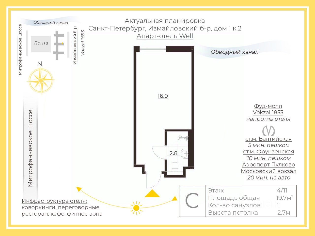 Проект находятся в Адмиралтейском районе на наб. Обводного канала. В пешей доступности сразу 2 метро: до "Балтийской" — 5 минут пешком, до "Фрунзенской" — 10 минут.