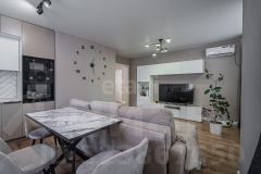 Планировка отличается практичностью и эффективным зонированием: большая кухня-гостиная с выходом на балкон, уютная спальня и изолированная гостевая комната. Кухня оснащена всей необходимой встроенной техникой, включая варочную панель и духовой шкаф. Санузел раздельный, с современной сантехникой и хорошо продуманным освещением. К новоселью не потребуется дополнительных вложений — в подарок новым владельцам остается вся существующая мебель, за исключением кровати, а также вся бытовая техника, включая холодильник и стиральную машину.