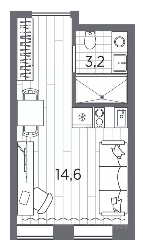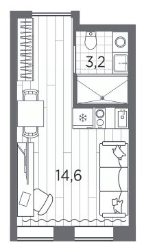 1-комн. апартаменты-студия с отделкой в ЖК "Industrial AVENIR" на 13 этаже. Общая площадь: 17.8 кв.м., площадь гостиной 14.6 кв.м., из которых 5 кв.м. выделено под кухонную зону. Все окна выходят на одну сторону. В апартаментах один совмещенный санузел. Высота потолков 2.5 м.