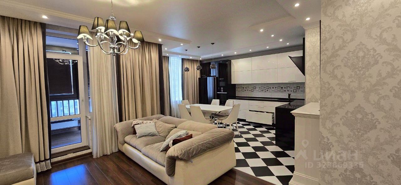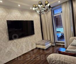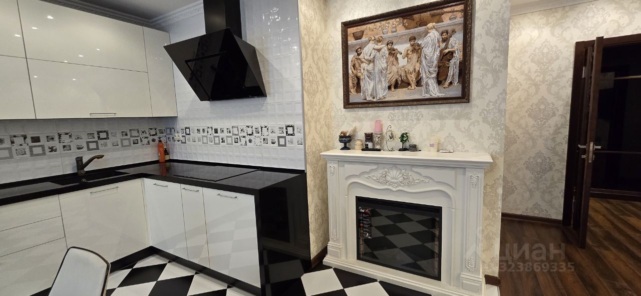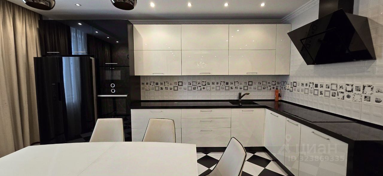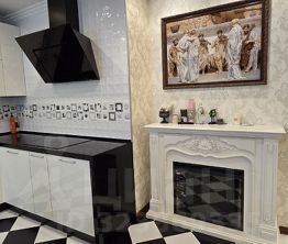 Кухня-гостиная: шикарный диван с большим телевизором, электрокамин, выход на вторую утеплённую лоджию, в которой небольшой диван, журнальный столик. В кухне отличная встроенная техника, двухкамерный холодильник, удобный кухонный гарнитур, столешница из камня.