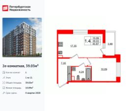 Удобная, классическая, функциональная европланировка, большая кухня-гостиная 17.35 м², просторная прихожая 7.35 м². Общая площадь квартиры - 39.03 м², жилая 10.09 м², высота потолка 2.77 м.