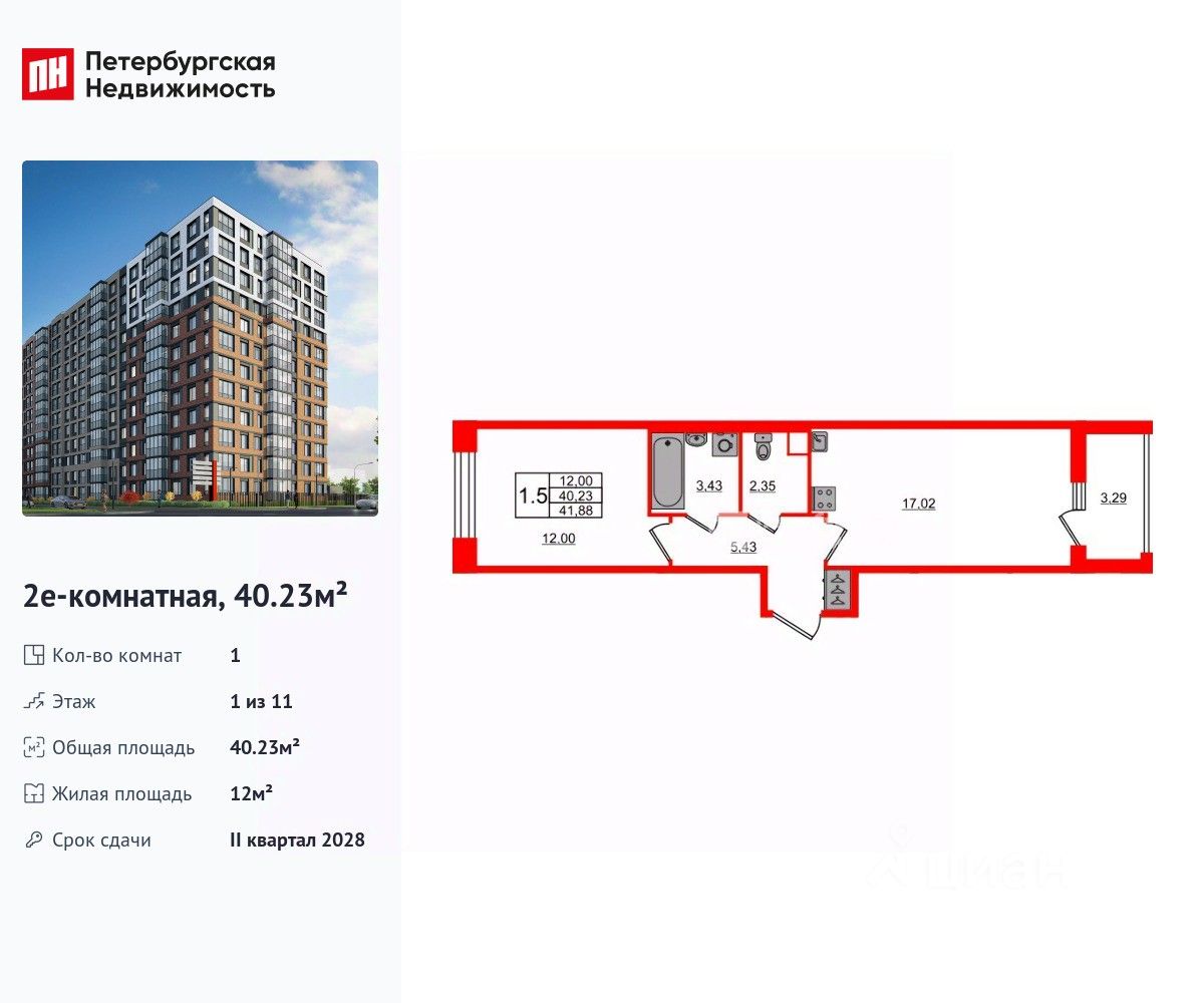Удобная, классическая, функциональная европланировка, большая кухня-гостиная 17.02 м², просторная прихожая 5.43 м². Общая площадь квартиры - 40.23 м², жилая 12 м², высота потолка 2.77 м.
