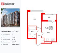 Удобная, классическая, функциональная европланировка, большая кухня-гостиная 14.19 м², вместительная прихожая 3.83 м². Общая площадь квартиры - 32.28 м², жилая 10.01 м², высота потолка 2.77 м.