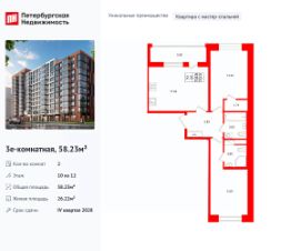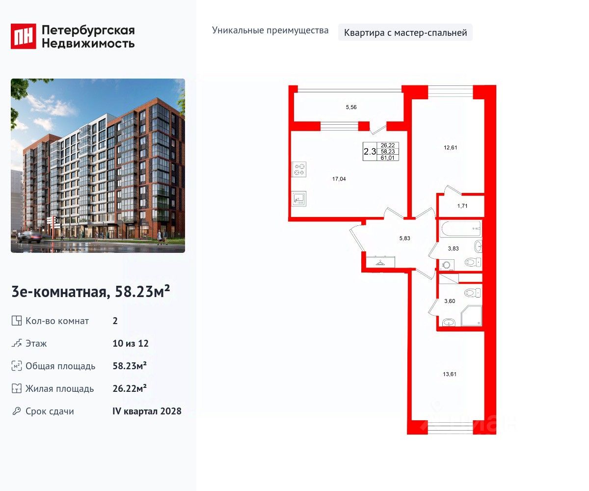 Уникальная, функциональная европланировка, большая кухня-гостиная 17.04 м², вместительная прихожая 5.83 м². Общая площадь квартиры - 58.23 м², жилая 26.22 м², высота потолка 2.77 м.