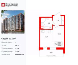 Удобная, классическая, функциональная европланировка, просторная прихожая 3.26 м². Общая площадь студии - 22.15 м², жилая 15.07 м², высота потолка 2.77 м.