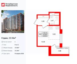 Удобная, классическая, функциональная европланировка, просторная прихожая 3.95 м². Общая площадь студии - 22.56 м², жилая 15.14 м², высота потолка 2.77 м.