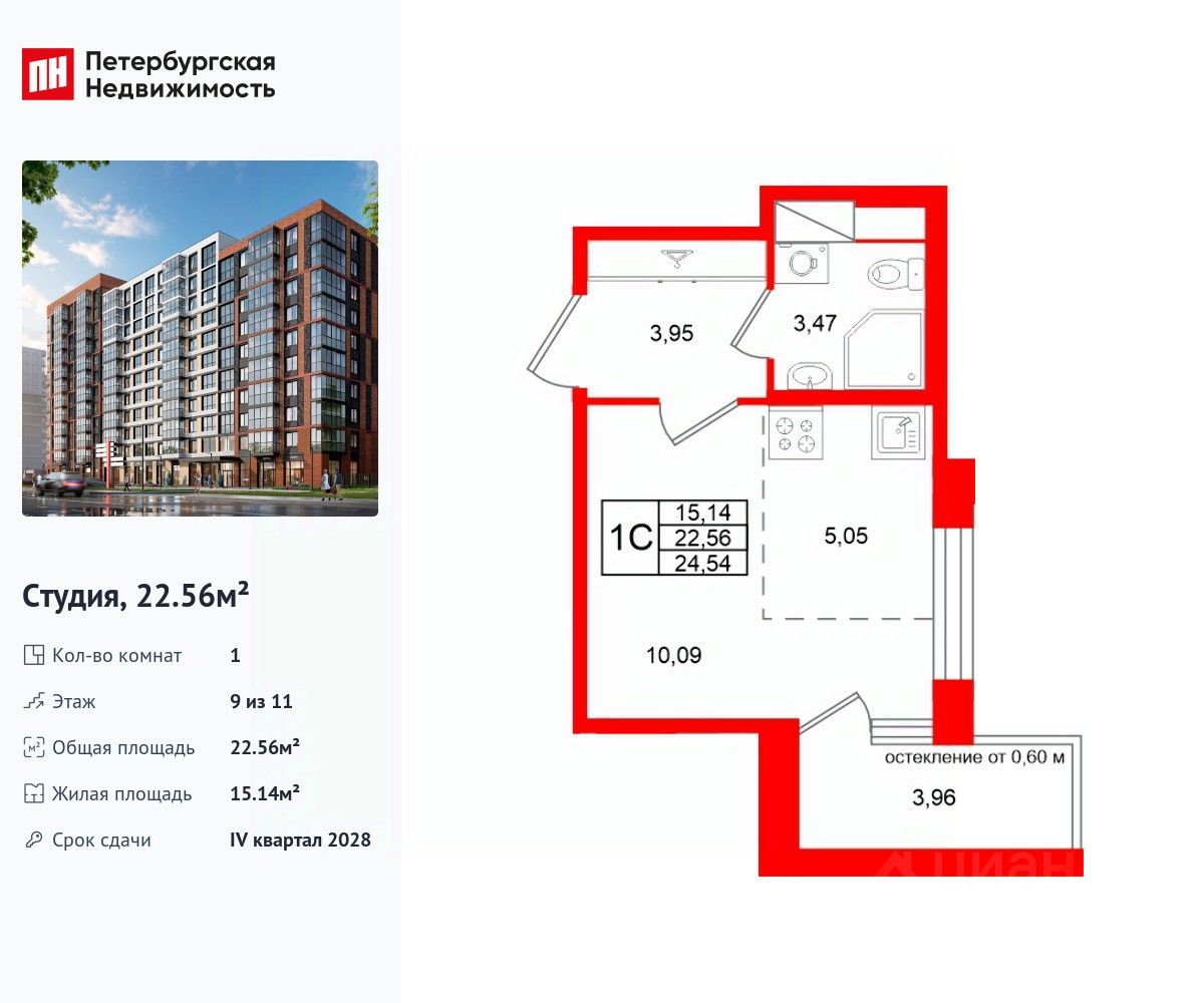 Удобная, классическая, функциональная европланировка, просторная прихожая 3.95 м². Общая площадь студии - 22.56 м², жилая 15.14 м², высота потолка 2.77 м.