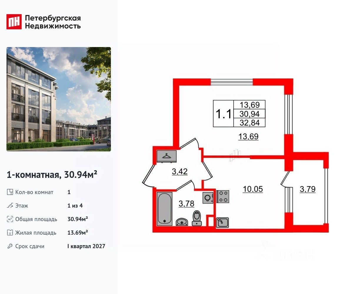Удобная, классическая планировка, кухня 10.05 м², вместительная прихожая 3.42 м². Общая площадь квартиры - 30.94 м², жилая 13.69 м², высота потолка 2.75 м.