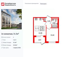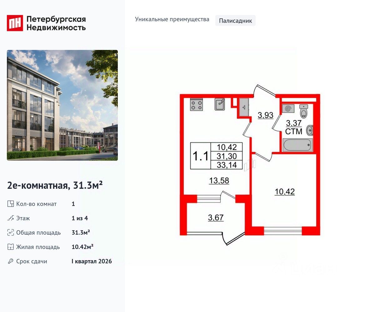 Уникальная, функциональная европланировка, большая кухня-гостиная 13.58 м², вместительная прихожая 3.93 м². Общая площадь квартиры - 31.3 м², жилая 10.42 м², высота потолка 2.75 м.