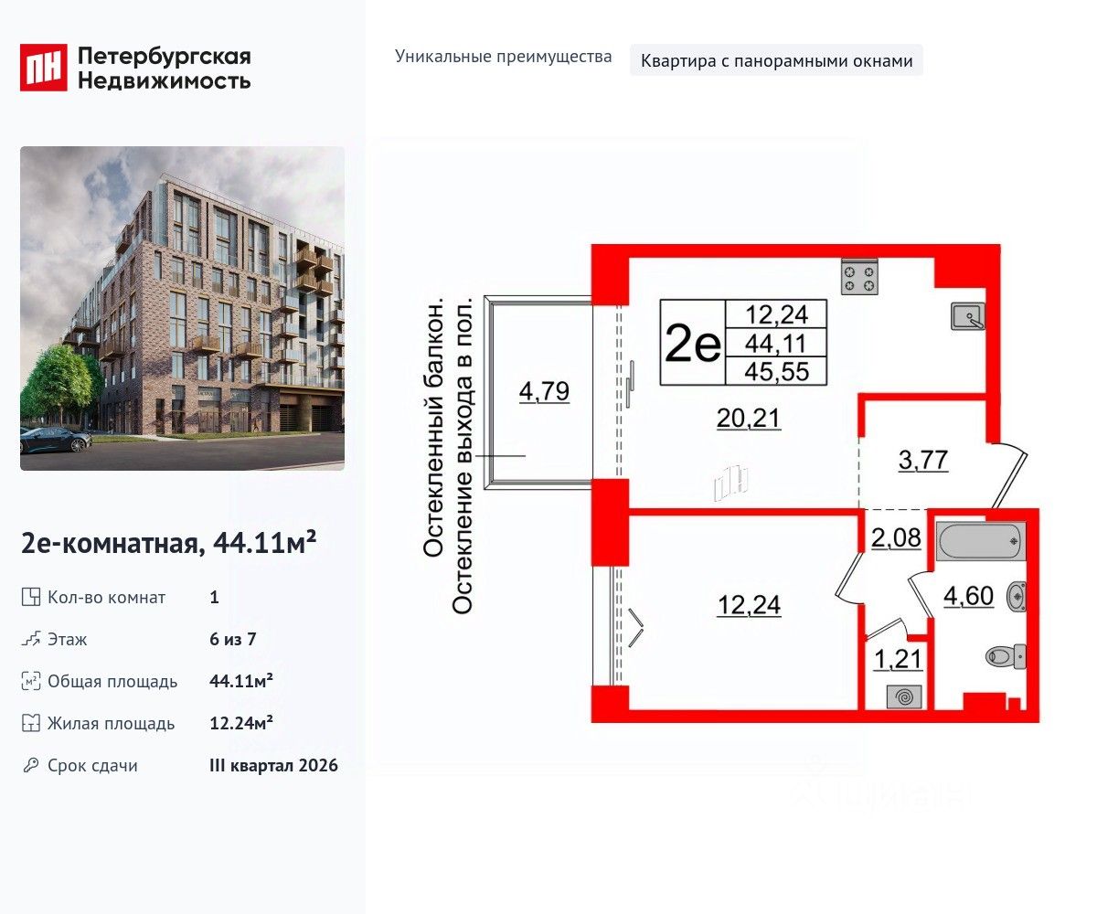 Уникальная, функциональная европланировка, большая кухня-гостиная 20.21 м², вместительная прихожая 3.77 м². Общая площадь квартиры - 44.11 м², жилая 12.24 м², высота потолка 3 м.