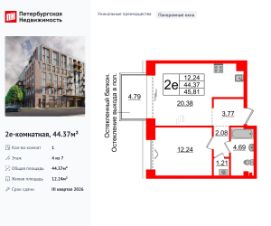 Уникальная, функциональная европланировка, большая кухня-гостиная 20.38 м², вместительная прихожая 3.77 м². Общая площадь квартиры - 44.37 м², жилая 12.24 м², высота потолка 3 м.