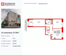 Уникальная, функциональная европланировка, большая кухня-гостиная 17.66 м², просторная прихожая 9.61 м². Общая площадь квартиры - 65.38 м², жилая 30.27 м², высота потолка 3 м.