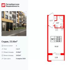 Удобная, классическая, функциональная европланировка, вместительная прихожая 3.17 м². Общая площадь студии - 25.06 м², жилая 18.02 м², высота потолка 2.77 м.
