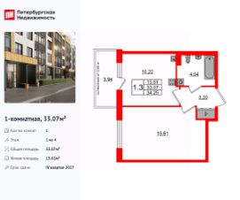 Удобная, классическая планировка, кухня 10.22 м², вместительная прихожая 3.2 м². Общая площадь квартиры - 33.07 м², жилая 15.61 м², высота потолка 2.77 м.