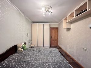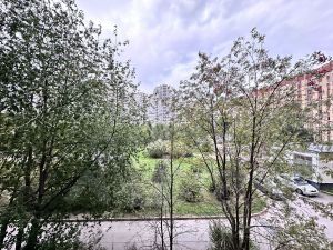 Спальня (15,5 м2) правильной формы, идеально помещается 2-х спальная кровать, большой шкаф, есть выход на застекленную лоджию. Окна выходят во двор, нет шума от трасс и пыли. Вид открывается на закрытый от проезжей части зеленый двор с березовой аллеей.