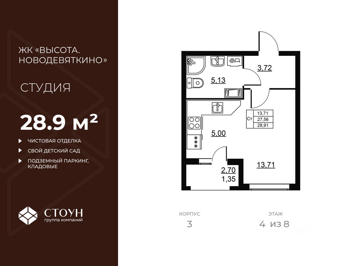 Продается квартира студия в жилом комплексе "Высота. Новодевяткино" от ГК СТОУН нa 4 этаже. Общaя площадь cоcтaвляeт 28.91 кв. м.