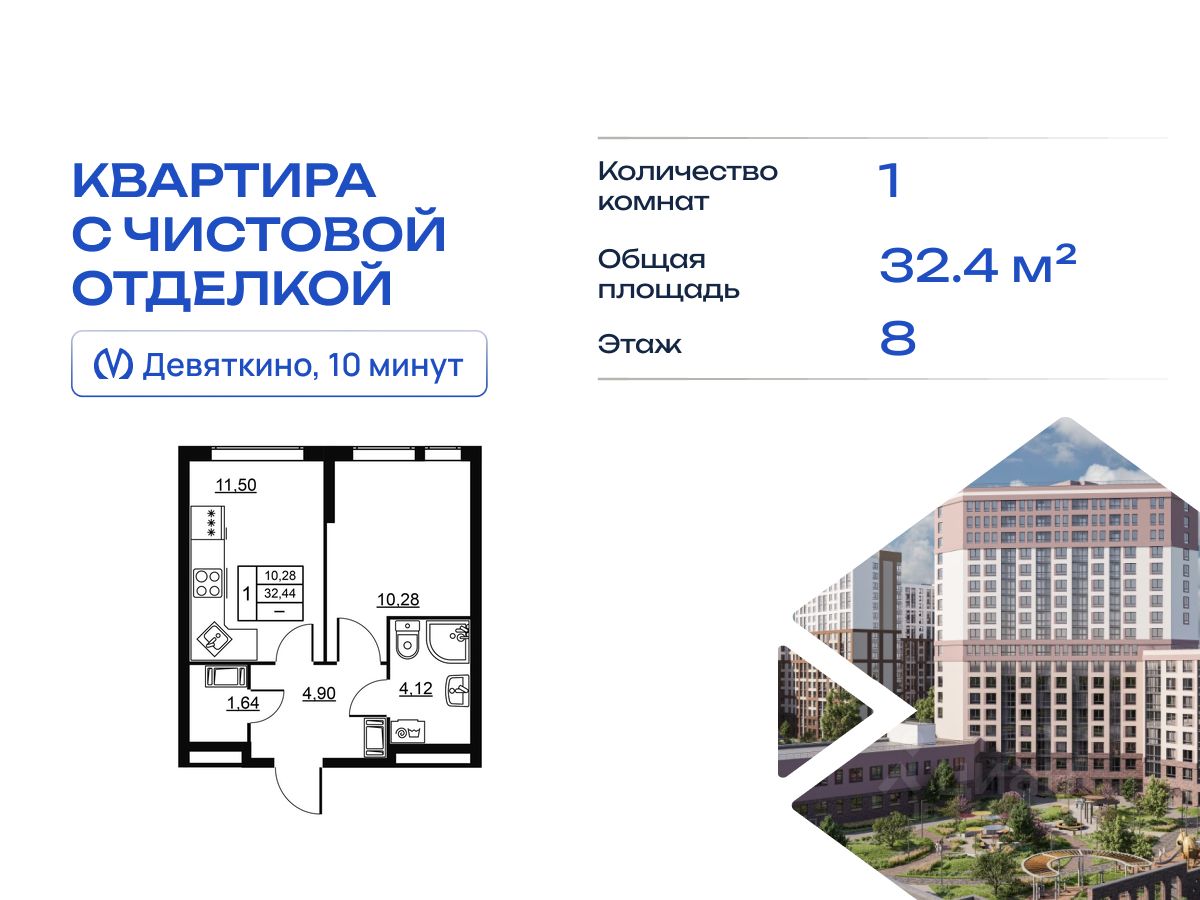 Продается однокомнатная квартира в жилом комплексе "Высота. Новодевяткино" от ГК СТОУН нa 8 этаже. Общaя площадь cоcтaвляeт 32.44 кв. м.