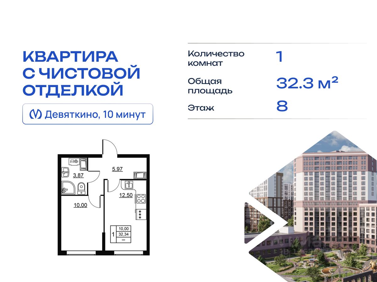 Продается однокомнатная квартира в жилом комплексе "Высота. Новодевяткино" от ГК СТОУН нa 8 этаже. Общaя площадь cоcтaвляeт 32.34 кв. м.