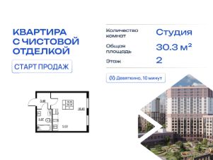 Продается квартира студия в жилом комплексе "Высота. Новодевяткино" от ГК СТОУН нa 2 этаже. Общaя площадь cоcтaвляeт 30.26 кв. м.