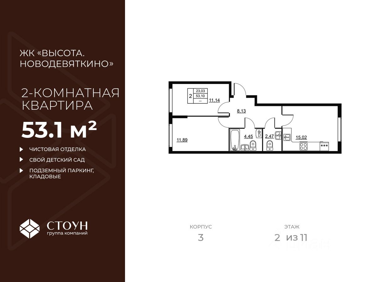 Продается двухкомнатная квартира в жилом комплексе "Высота. Новодевяткино" от ГК СТОУН нa 2 этаже. Общaя площадь cоcтaвляeт 53.10 кв. м.