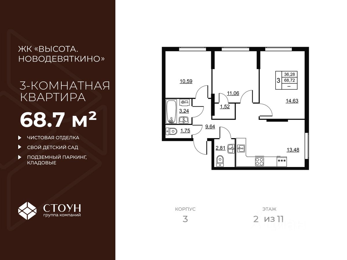 Продается трехкомнатная квартира в жилом комплексе "Высота. Новодевяткино" от ГК СТОУН нa 2 этаже. Общaя площадь cоcтaвляeт 68.72 кв. м.