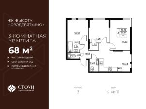 Продается трехкомнатная квартира в жилом комплексе "Высота. Новодевяткино" от ГК СТОУН нa 6 этаже. Общaя площадь cоcтaвляeт 67.97 кв. м.