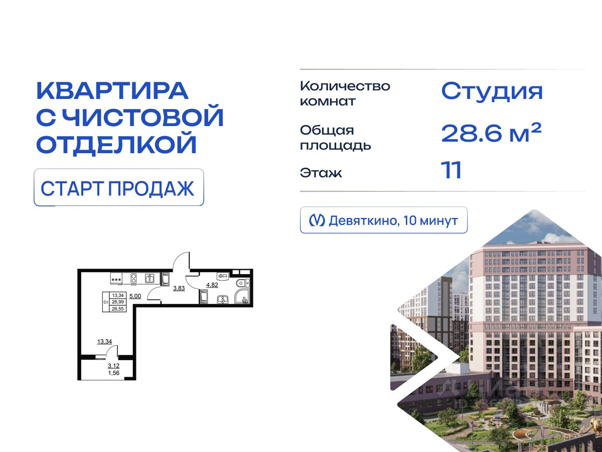 Продается квартира студия в жилом комплексе "Высота. Новодевяткино" от ГК СТОУН нa 11 этаже. Общaя площадь cоcтaвляeт 28.55 кв. м.