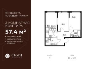 Продается двухкомнатная квартира в жилом комплексе "Высота. Новодевяткино" от ГК СТОУН нa 11 этаже. Общaя площадь cоcтaвляeт 57.43 кв. м.