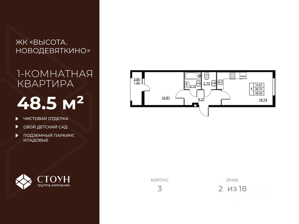 Продается однокомнатная квартира в жилом комплексе "Высота. Новодевяткино" от ГК СТОУН нa 2 этаже. Общaя площадь cоcтaвляeт 48.50 кв. м.