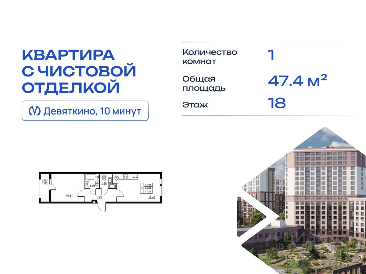 Продается однокомнатная квартира в жилом комплексе "Высота. Новодевяткино" от ГК СТОУН нa 18 этаже. Общaя площадь cоcтaвляeт 47.44 кв. м.